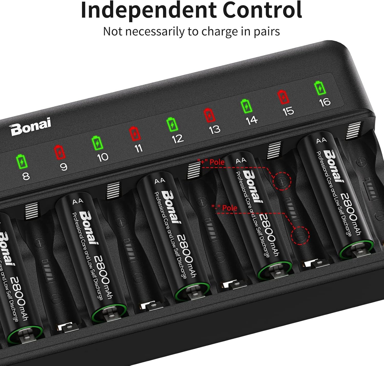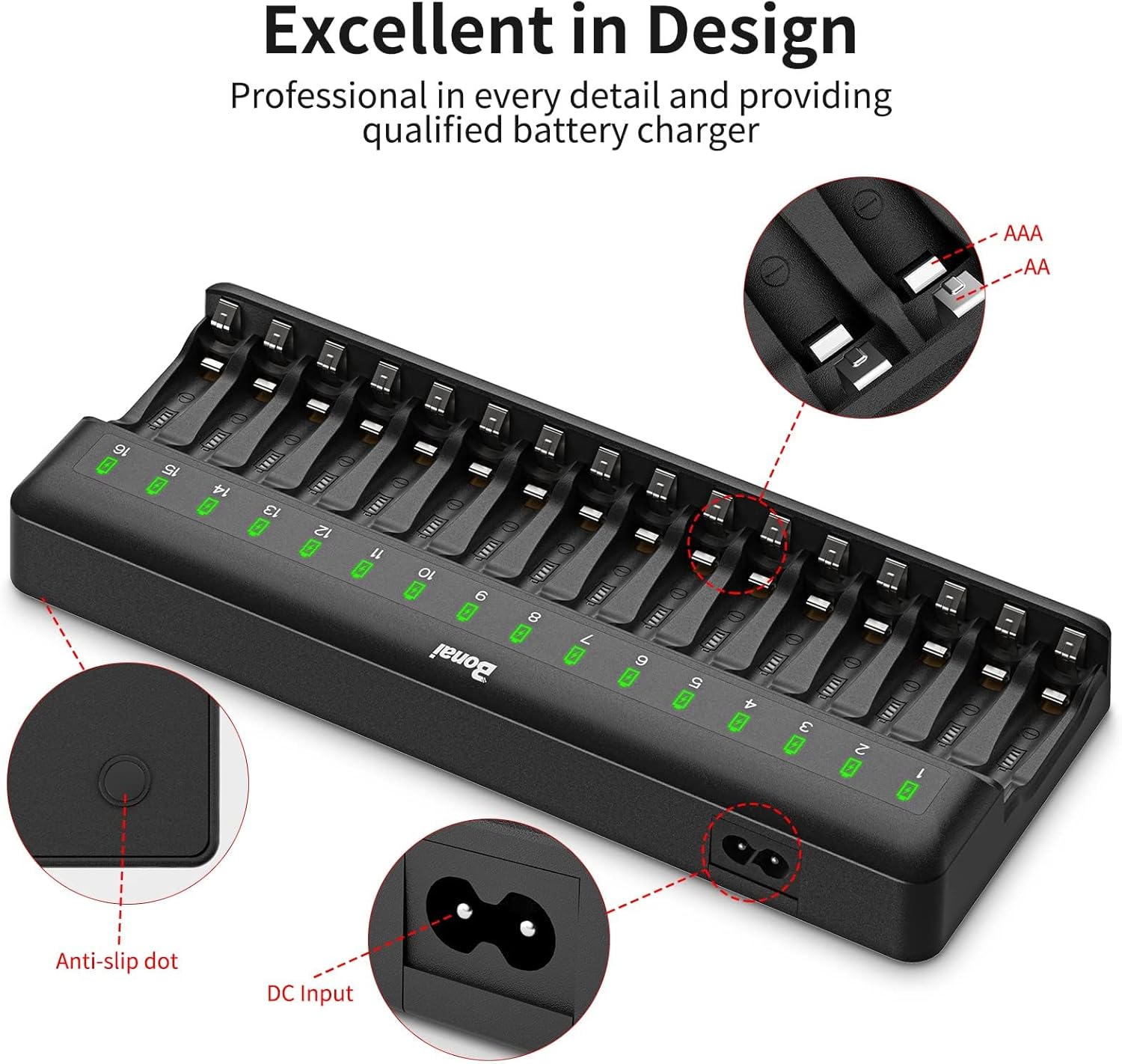 Efficiënte 16-slot batterijlader voor 1.2V AA AAA C en D batterijen (Ni-MH/Ni-CD). Deze krachtige oplader biedt de mogelijkheid om tot 16 cellen gelijktijdig op te laden. Met een 12V/2A ingang ondersteunt het snel opladen met automatische switch naar trickle charging bij volledige lading. Veiligheidsvoorzieningen waaronder oververhitting bescherming garanderen een betrouwbaar gebruik. Geschikt voor elke netspanningsinvoer maakt deze lader het opladen van batterijen eenvoudig en efficiënt.