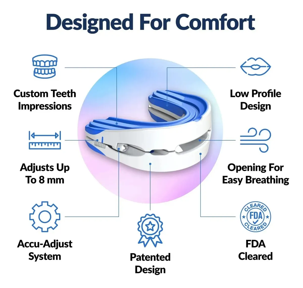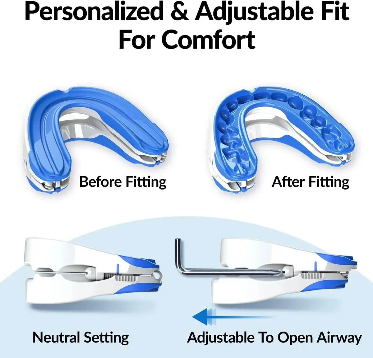Deze snurkbeschermingsrail past zich aan uw mond aan en zorgt zo voor een comfortabele slaapervaring zonder snurken. Daarnaast biedt het bescherming tegen externe schade aan uw tanden en helpt het de tandpositie te corrigeren voor een betere mondgezondheid.