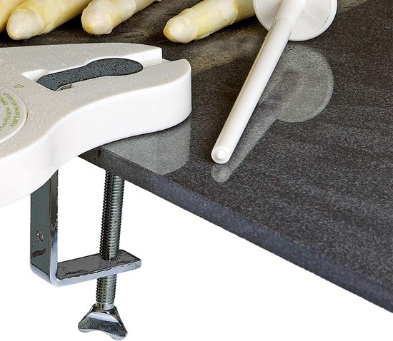 Deze vernieuwde versie van de aspergeschiller is onmisbaar in elke keuken. Met verbeterde mechanica en volledig opnieuw ontworpen messen, is dit product wereldwijd gepatenteerd.