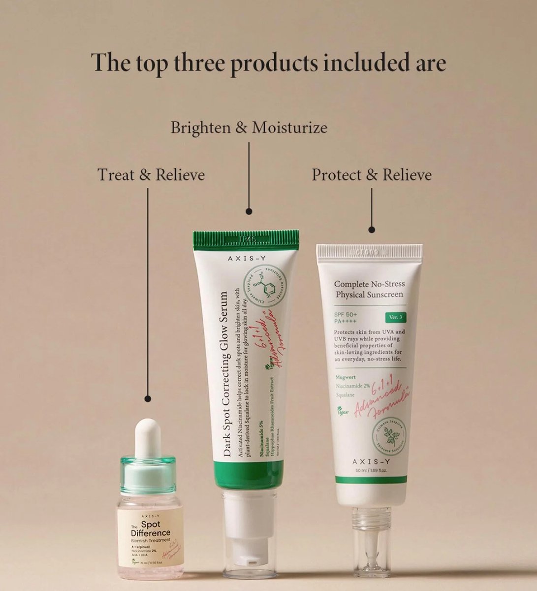 - Complete No-Stress Physical Sunscreen V3 (50 ml): Een zonnebrandcrème met SPF50+ PA++++, speciaal geformuleerd voor de acnegevoelige, vette en gevoelige huid. Bevat extracten van bijvoet, niacinamide en squalane om de huid te hydrateren en te kalmeren, terwijl het beschermt tegen UVA- en UVB-straling.