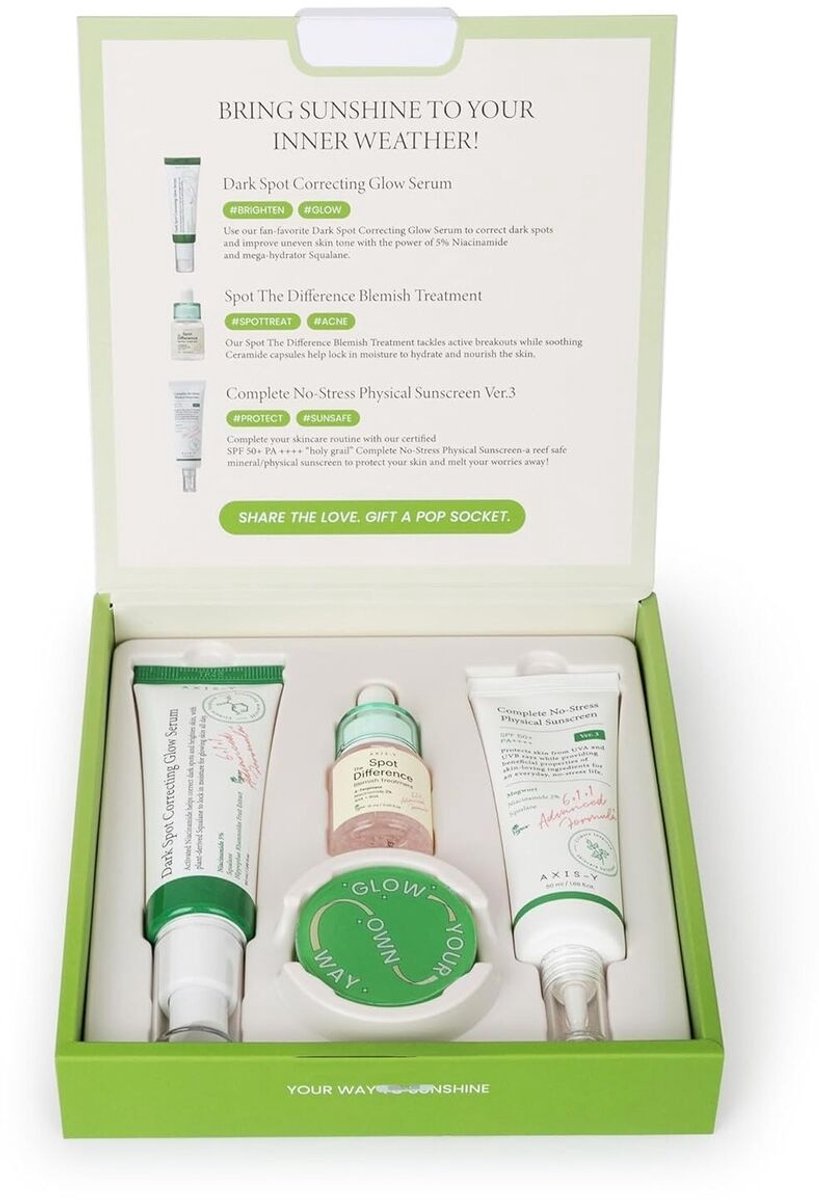 De AXIS-Y What Is Your Weather Beauty Box is een zorgvuldig samengestelde set die zich richt op het verbeteren van de huidtextuur, het verminderen van onzuiverheden en het beschermen tegen schadelijke UV-stralen. Deze 5-delige set bevat drie van de bestsellers van AXIS-Y.