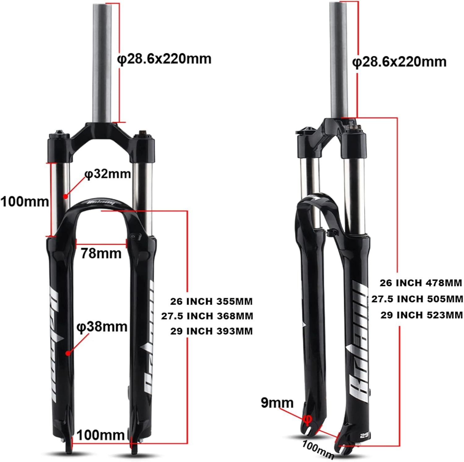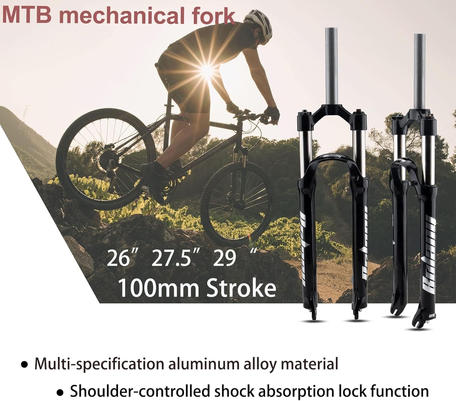 - 【Specificaties】: 26 / 27,5 / 29 inch optioneel, ALLEEN rechte stuurbuis, Crown handmatige vergrendeling. Veerweg: 100 mm. As: 9 mm * 100 mm, Remtype: schijfremmen.