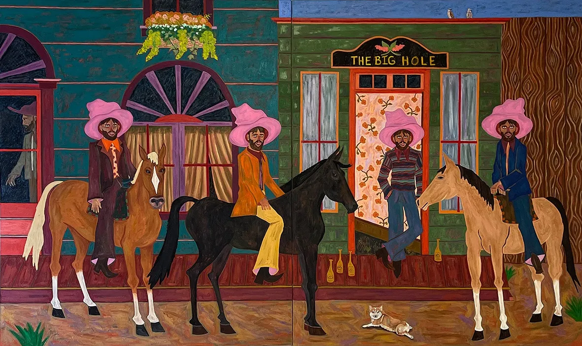 Crase, die in San Diego woont en werkt, staat bekend om zijn karakteristieke figuratieve schilderijen die vaak personages met oversized roze hoeden in historische of surrealistische western-omgevingen tonen. Zijn werk verkent thema’s rond mannelijkheid en de geschiedenis van de Amerikaanse ‘frontier’.