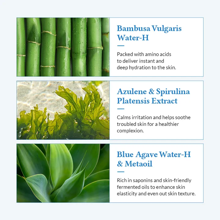 Bevat azulene, Spirulina Platensis-extract voor het kalmeren van geïrriteerde huid en blauw agavewater-H voor het verbeteren van de huidelasticiteit.