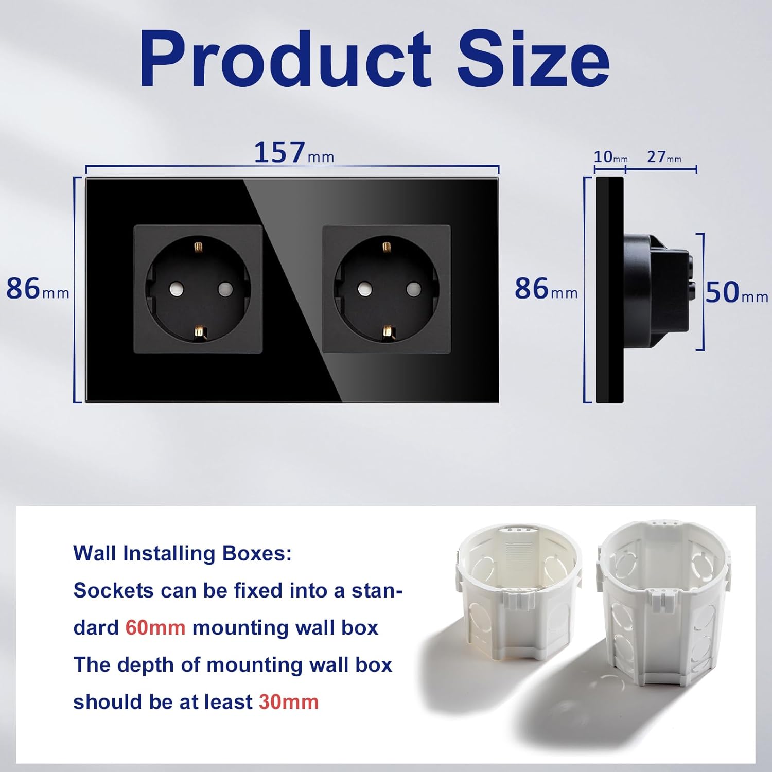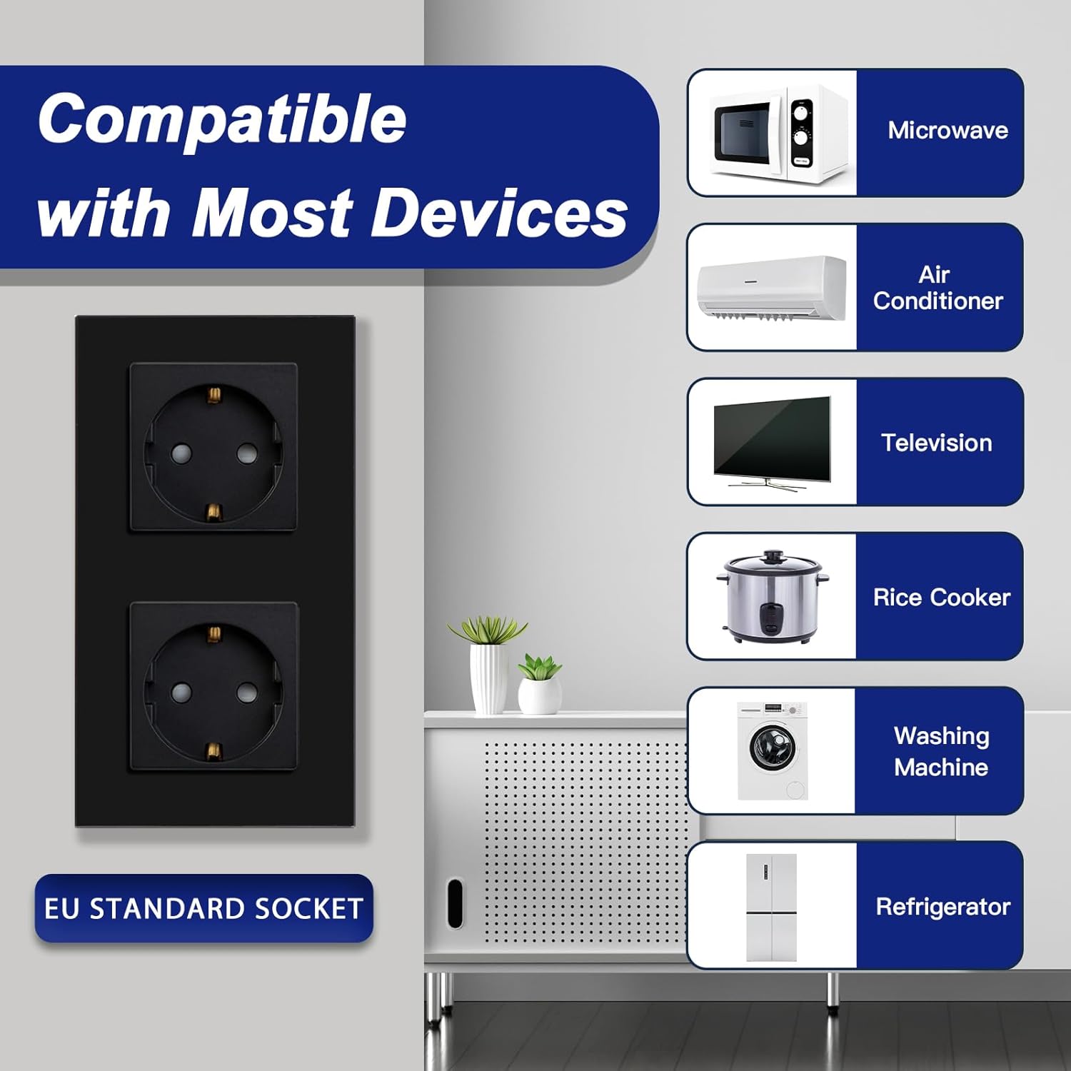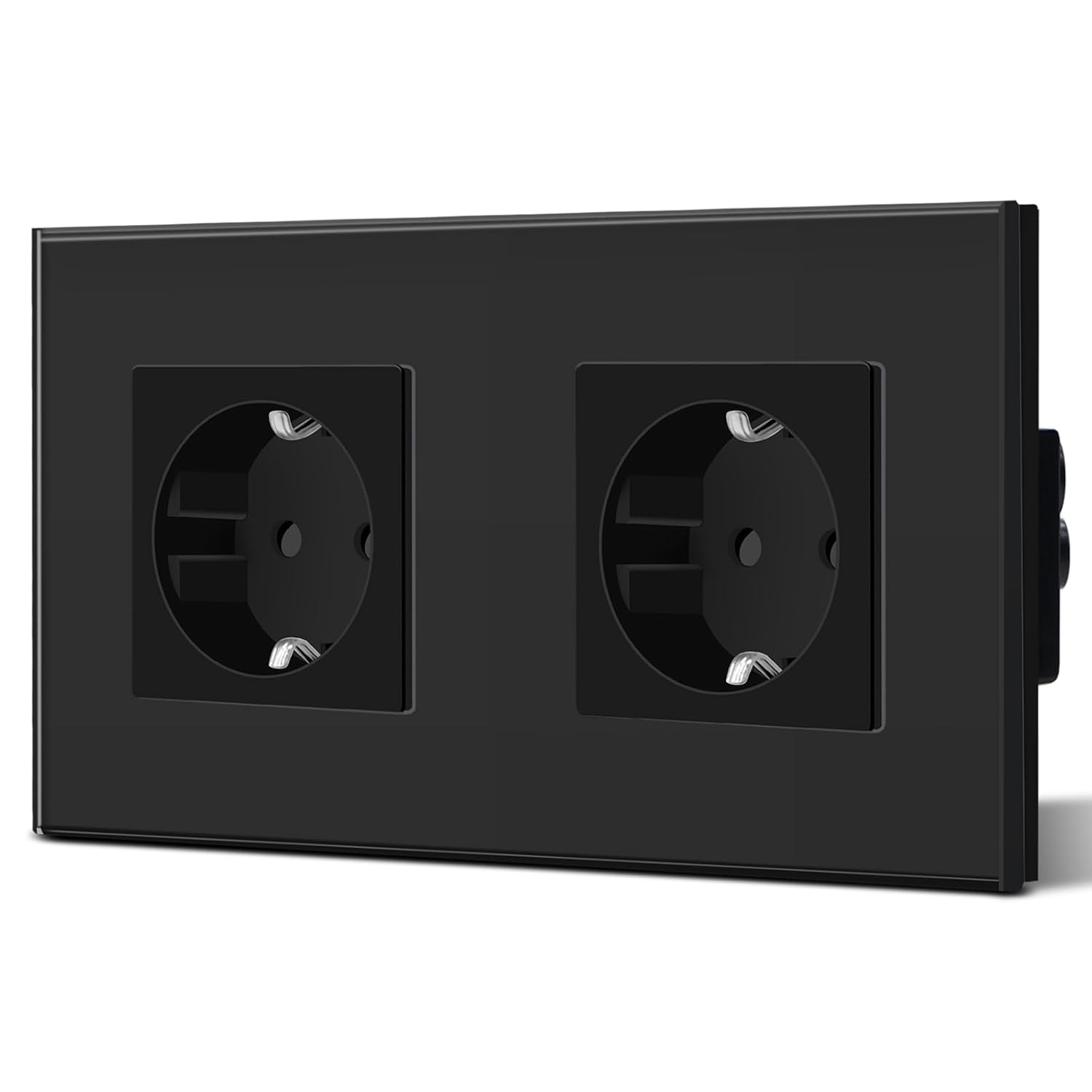 Dubbele Wandcontactdoos Zwart 16Amp Glas Schuko Stopcontacten Inbouw Contactdoos – 157 * 86Mm 250V 1 Vak – Hoge Kwaliteit