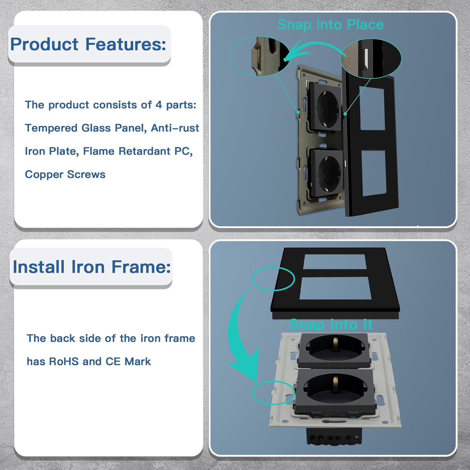 Met een schroefloze snap-on plaat en een inbouwdoosdiepte van 30 mm is dit stopcontact eenvoudiger te installeren dan traditionele modellen. Installatiemateriaal en instructies zijn inbegrepen, waardoor je het stopcontact snel en gemakkelijk kunt monteren.