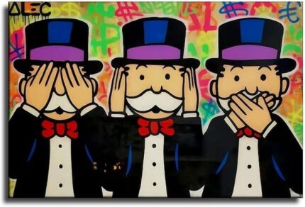 Dit kunstwerk is een graffiti-canvasposter van het personage Monopoly Man, geïnspireerd op het werk van de kunstenaar Alec Monopoly.