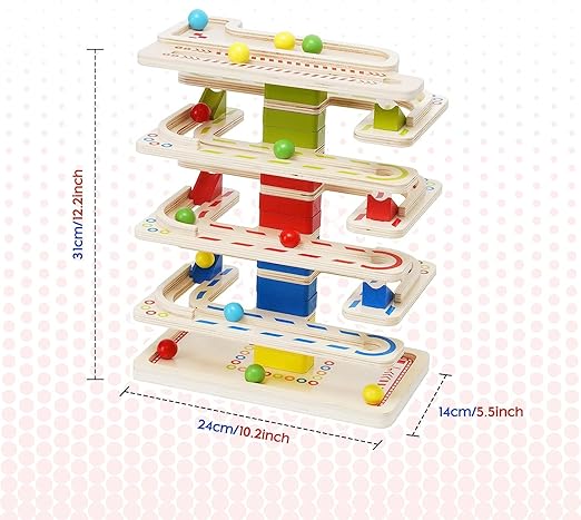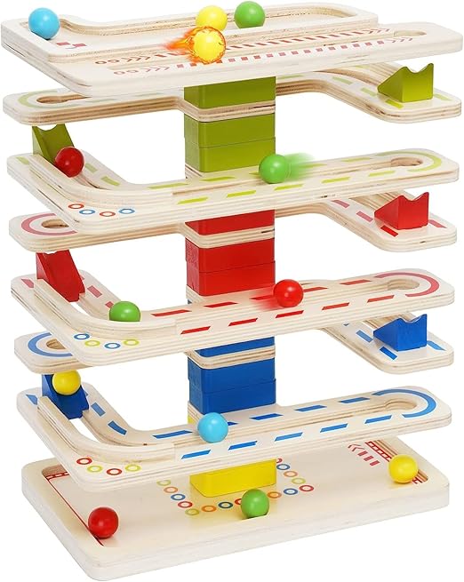 - Houten speelgoed voor kinderen van 1, 2, 3 en 4 jaar: Deze houten racebaan voor peuters heeft 8 hellingen en 16 ballen. De vrolijk gekleurde ballen rollen over de rand van de baan en vallen automatisch en nauwkeurig op de onderste helling.
