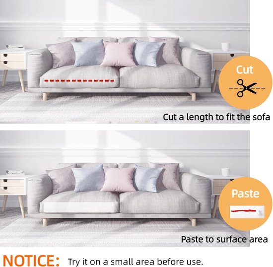 • 【Gebruiksvriendelijk】1. Knip een klein stukje van de antikrastape en test het op een klein gebied voordat u het gebruikt om er zeker van te zijn dat het het oppervlak van het meubel niet beschadigt. 2. Reinig en meet het gebied waar u de antikrastape moet plakken. 3. Knip een stuk tape van de gewenste lengte en plak het op de te plakken plek. 4. Verwijder de witte achterkant van de antikrastape.