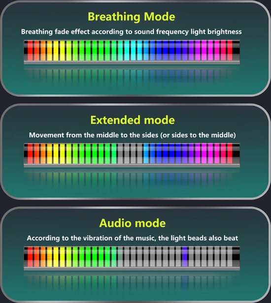 De muziekbar is uitgerust met een reeks heldere LED-lampen die een scala aan kleuren en lichteffecten produceren. Je kunt kiezen uit verschillende modi, zoals een pulserende lichtshow, een kleurverloop of een reactieve modus die synchroniseert met het ritme van de muziek. Deze veelzijdige verlichtingsmodi stellen je in staat om de juiste sfeer te creëren, of je nu een energieke dansvloer wilt of een ontspannen ambiance.