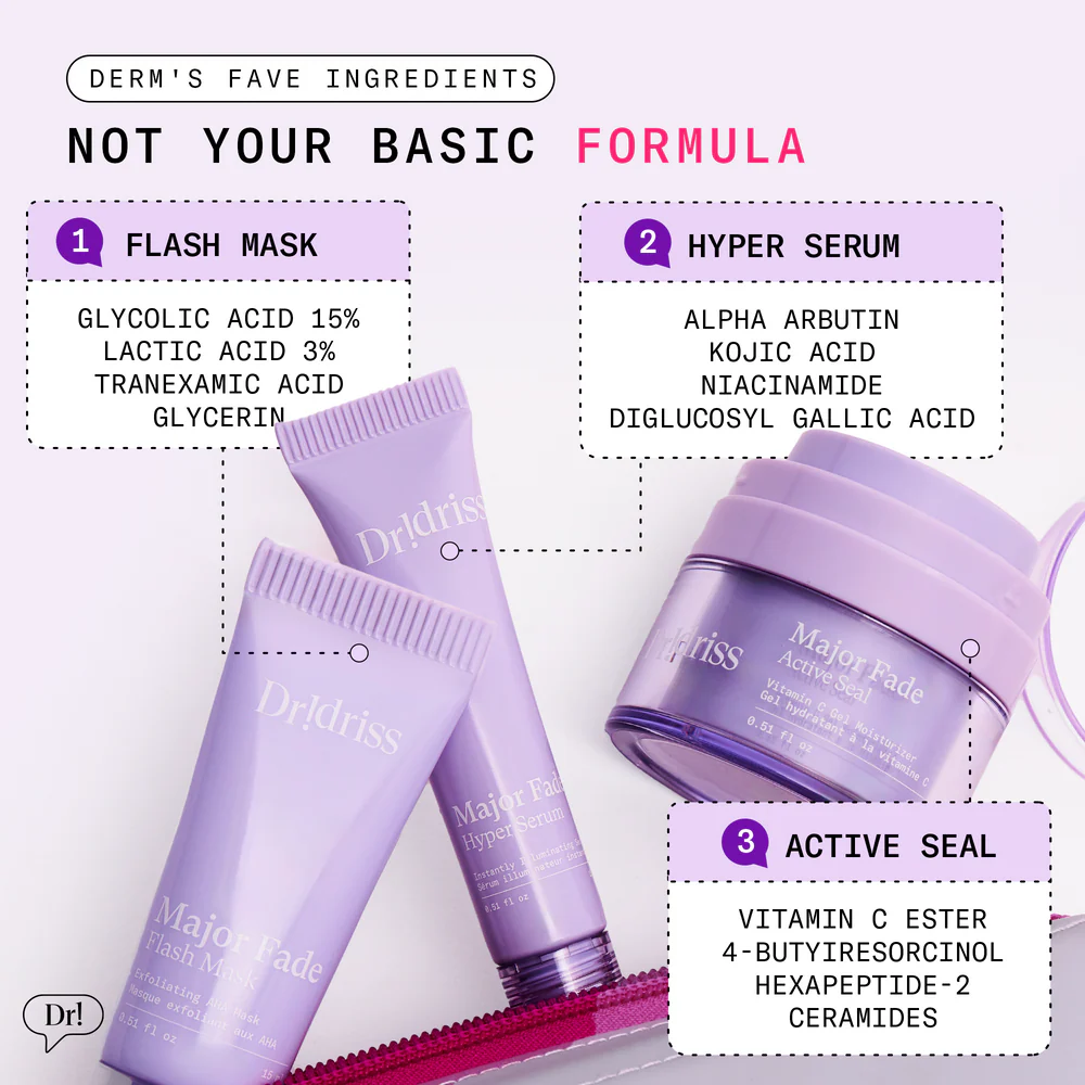 Je volledige huidverzorgingsroutine onderweg uitvoeren kan lastig zijn, dus laat je huid stralen met Dr. Idriss aan je zijde. Dit reisvriendelijke trio bevat het bestverkochte Major Fade Solution System, dat verkleuringen en hyperpigmentatie vervangt door een stralende, heldere huid.