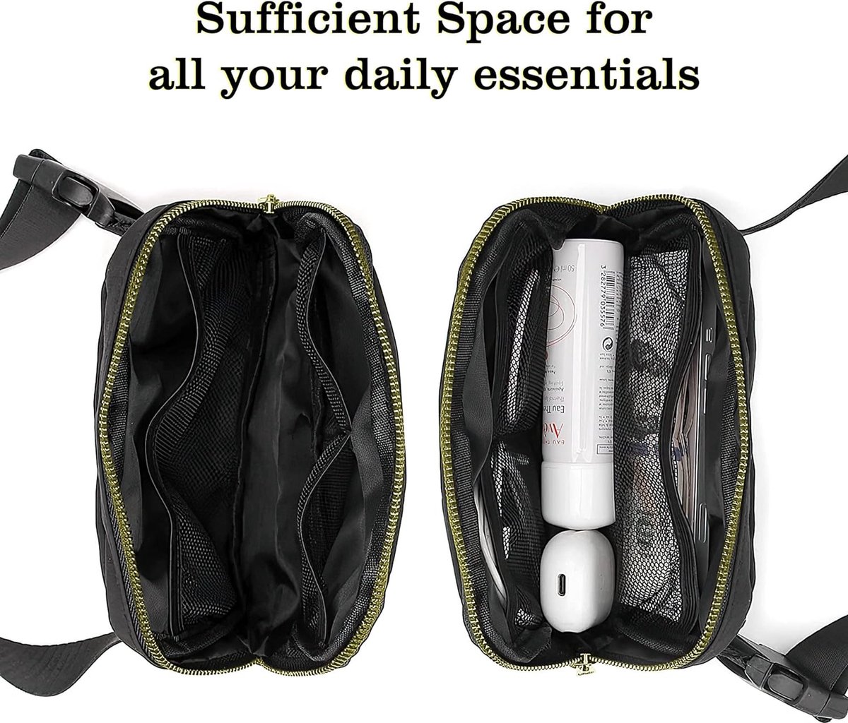 Twee ruime vakken, 1 x voorkant en 1 x achterkant, geven je voldoende opbergruimte voor spullen die er absoluut bij moeten zijn: mobiele telefoon, portemonnee en sleutels.