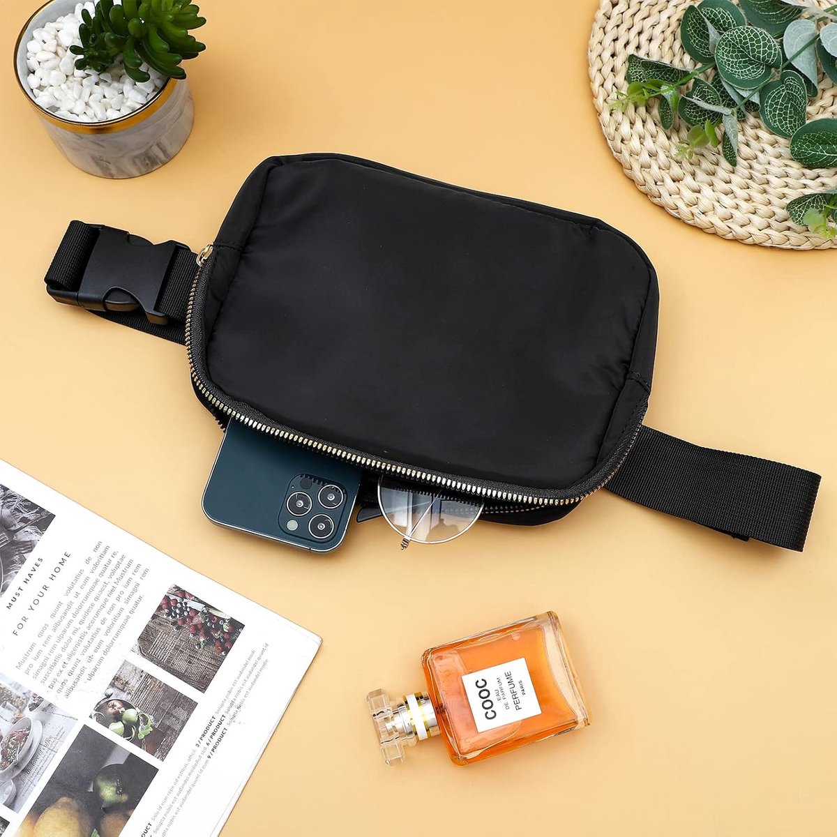 Twee ruime vakken, 1 x voorkant en 1 x achterkant, geven je voldoende opbergruimte voor spullen die er absoluut bij moeten zijn: mobiele telefoon, portemonnee en sleutels. De eenvoudige look van de heuptas maakt het modieuze accessoire tot de ideale metgezel voor festivals, feestjes en andere evenementen. Stijlvol uiterlijk en toch praktisch blijven! Niet zonder reden is een heuptas een veelgebruikte uitrusting – hij is licht, houdt handen en rug vrij, ook bij sportieve activiteiten van welke aard dan ook. Door de verstelbare riem kan de tas in een handomdraai aan je figuur worden aangepast. De volledige lengte maakt zelfs het casual dragen over de schouder mogelijk. Oh ja!