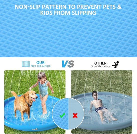 - Antislip en veilig: de onderkant van de waterstraalmat heeft een rasterpatroon, maar is niet oneffen. Om te voorkomen dat kinderen en honden vallen als ze in het water spelen, hebben we het antislip-oppervlak verbeterd. Het mondstuk van het waterspel is in de mat gedraaid, en schiet niet los van de sterke waterstraal. Laat jongens, meisjes en honden deze zomer vrolijk en veilig spelen.