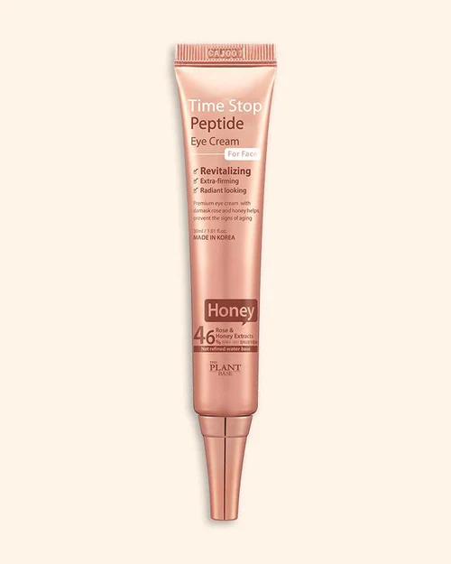 De Plant Base Time Stop Peptide Eye Cream is een luxe oogcrème die ook op het gezicht en de hals kan worden gebruikt. Het product is ontworpen om de huid rond de ogen te verwennen en te regenereren met ingrediënten zoals honing, rozenbloemextract en peptiden.