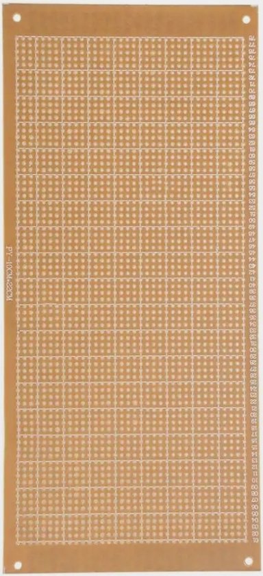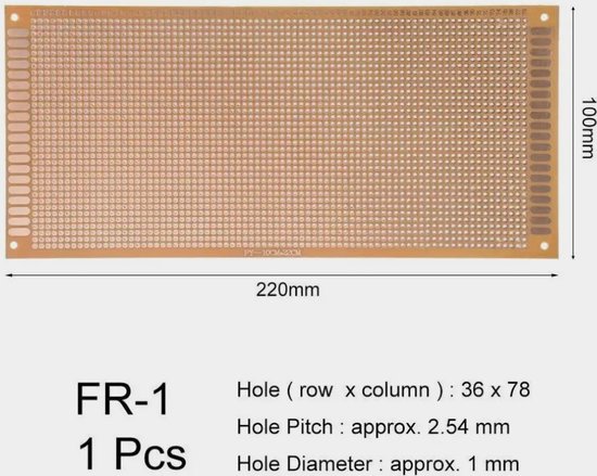 - PARAMETERS – Dikte: ca. 1,2 mm; Gatafstand: ca. 2,54 mm; Gatdiameter: ca. 1,0 mm; Afmetingen: ca. 10 x 22 cm / 3,9 x 8,6 inch (B x L); Gat (rij x kolom): 78 x 36.