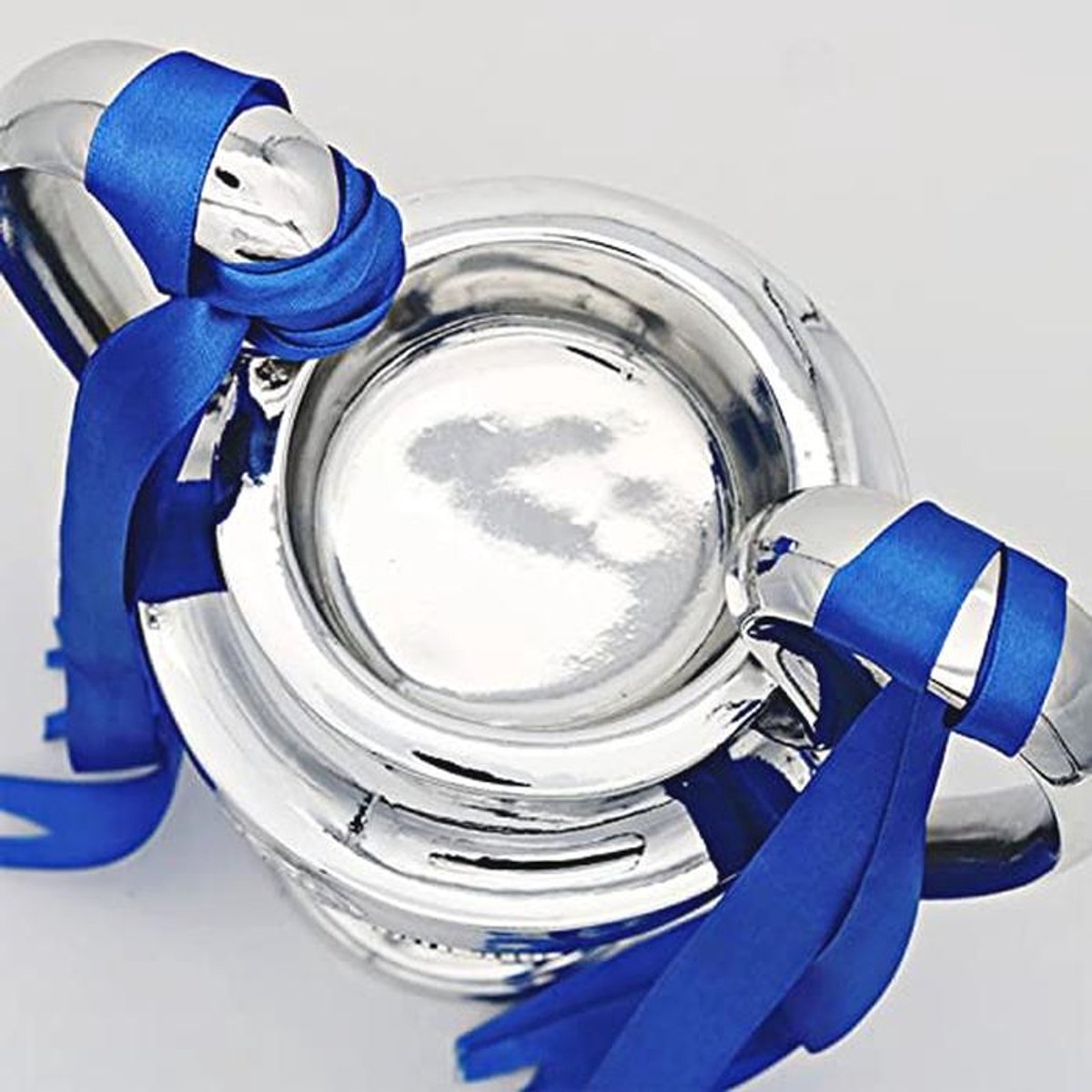 Deze hoogwaardige replica van de Champions League beker is vervaardigd van duurzaam hars en is een perfect aandenken voor voetbalfans. De trofee komt met een verchroomd zilveren afwerking en een blauw lint, waardoor hij een stijlvolle toevoeging is aan je kamerdecoratie. Ideaal als cadeau voor fans of als decoratief stuk op kantoor.