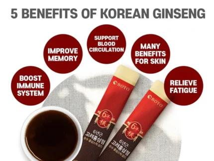 BOTO Korean Red Ginseng Extract Pure Stick Gold is een hoogwaardig voedingssupplement, gemaakt met 100% Koreaanse rode ginseng die zes jaar gerijpt is. Deze variëteit staat bekend om zijn krachtige werking en rijke voedingswaarde. Dit geconcentreerde ginsengextract is ontworpen om de algehele vitaliteit te ondersteunen, het immuunsysteem te versterken, dagelijkse vermoeidheid tegen te gaan en het energieniveau te verhogen. Daardoor is het ideaal voor mensen met een drukke levensstijl of periodes van fysieke en mentale belasting.