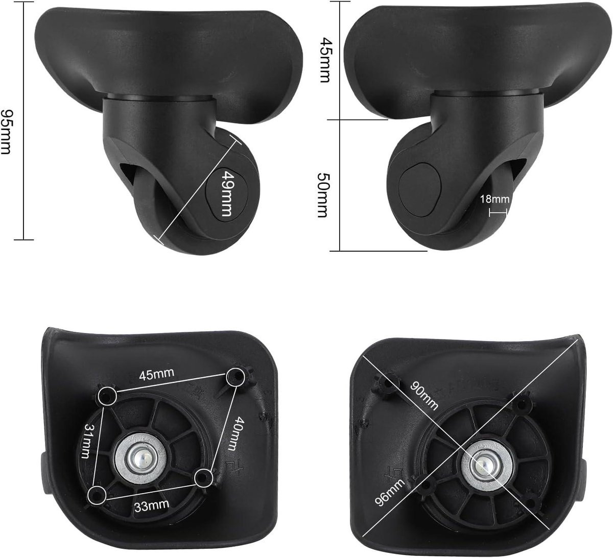 Deze bagagekoffer vervangende wielen zijn perfect voor iedereen die op zoek is naar duurzame en veelzijdige wielen. Ze zijn ideaal voor kleine apparatuur, meubels en nog veel meer. Met de totale vergrendelingsrem heb je volledige controle over het wiel en de wartel tegelijkertijd. Daarnaast zijn deze wielen glad, stil en stevig, waardoor ze perfect zijn voor verschillende toepassingen.