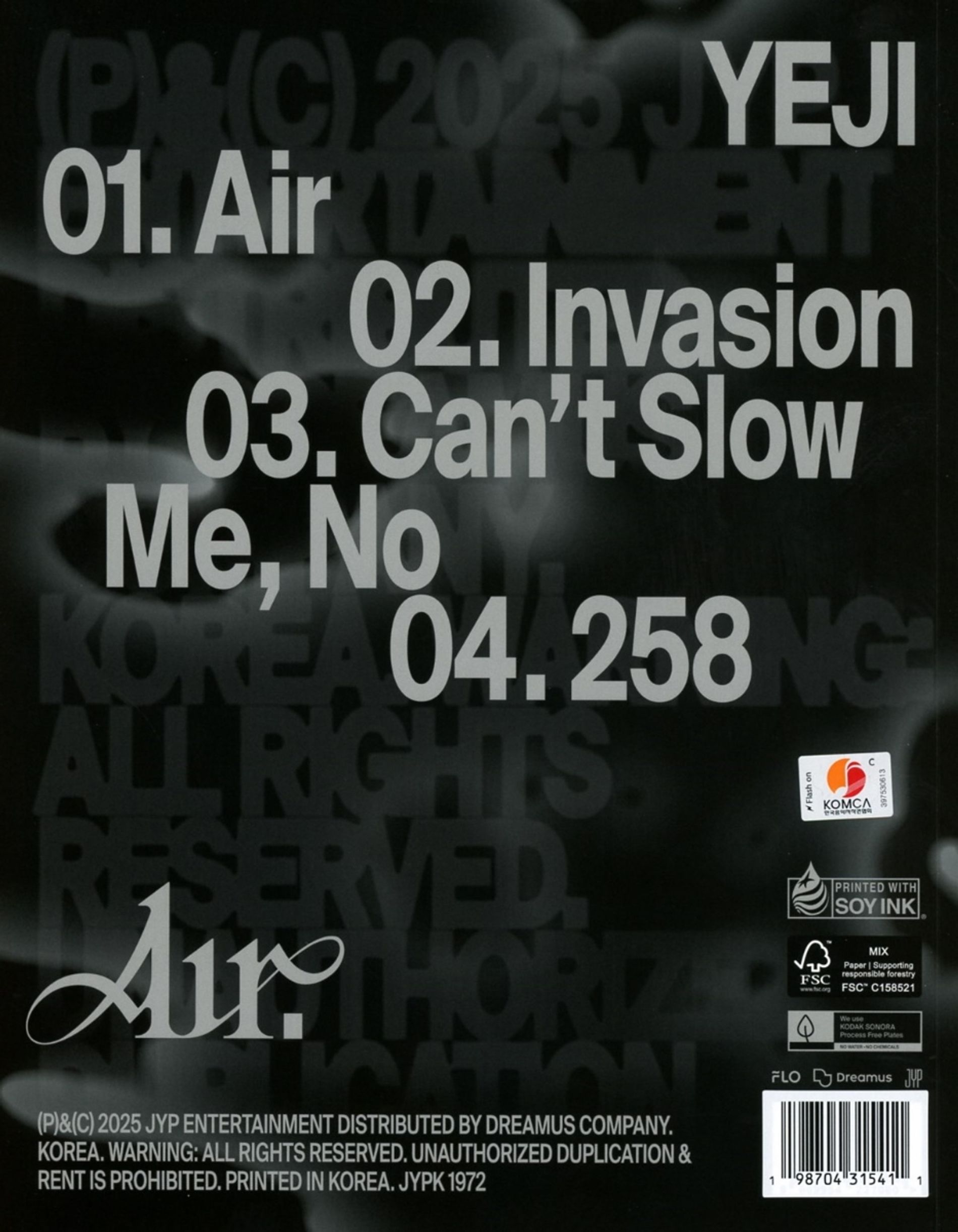Air van Yeji, met release datum 21 maart 2025.Deze versie van Air verschijnt als een 1xCD. Deze release bevat (een) Fotoboek & Poster(s) & Postkaart(en) & Sticker(s) etc.